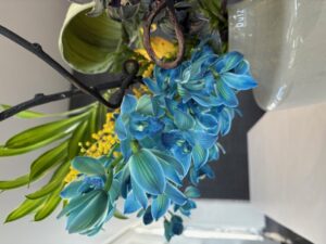 青いシンビジウムがアクセントに、黒い枝が締色になるとってもカッコいい作品⚡