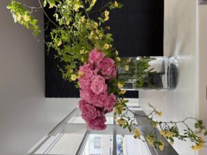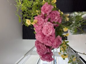 ピンクでふんわりとしたトルコキキョウと軽やかなモッコウバラの組み合わせが